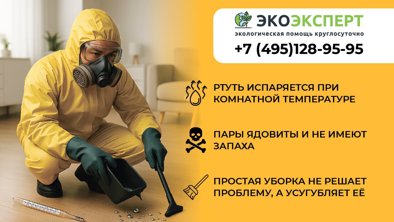 Попытка убрать ртуть с пола без приборов и специальных демеркуризационных составов опасна — часть металла останется в щелях, а испарение продолжится. Необходимо вызвать специалистов.